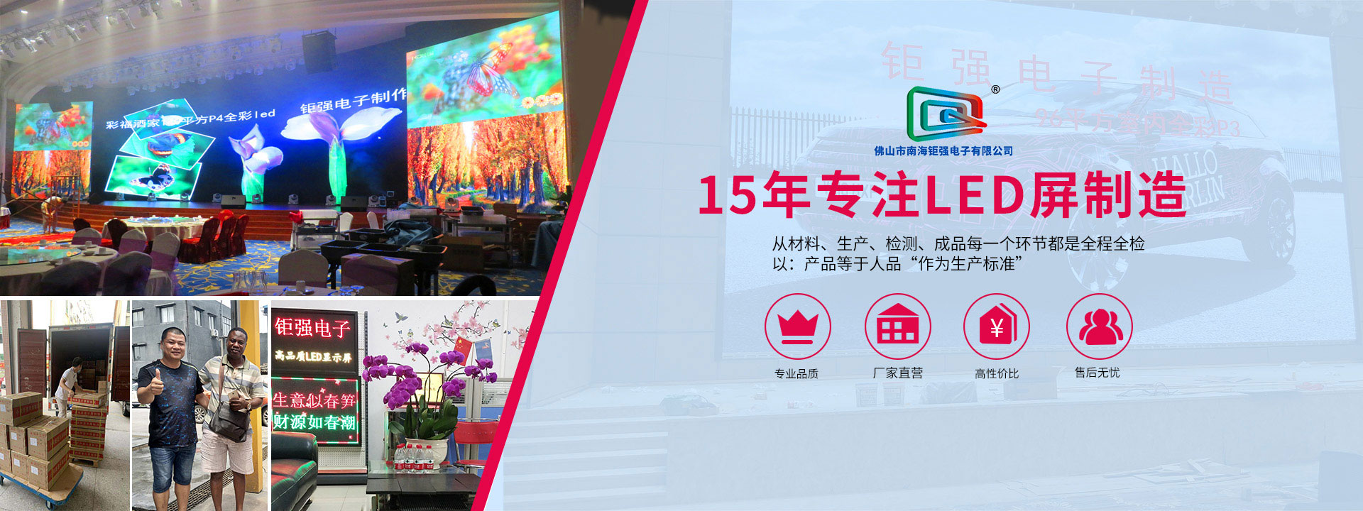 佛山市南海鉅強電子有限公司是專業致力于LED顯示屏的研究、生產、銷售、工程服務的企業。主營LED顯示產品:室內小間距LED顯示屏、室內全彩LED顯示屏、戶外全彩LED顯示屏、LED舞臺租賃屏、LED異形屏、排隊叫號屏、車間工業看板、并批發多種型號LED邊框鋁材及相關配件...